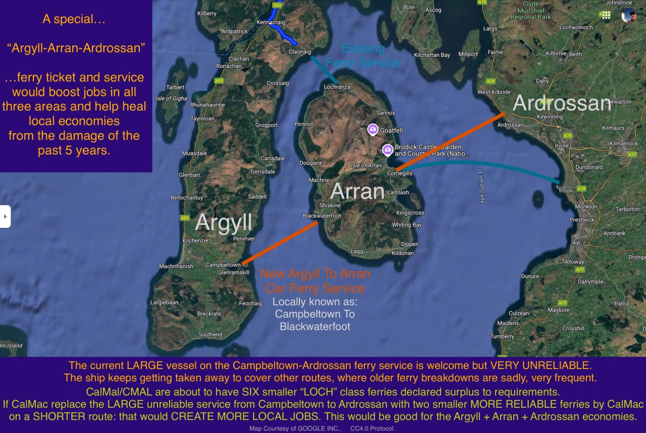 Important: We are not wishing to engage in the political footballs of this, just help repair the economic difficulties of the past few years at Campbeltown + Arran + Ardrossan.